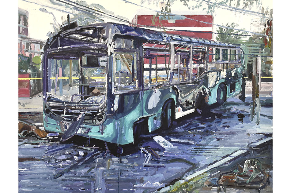 El trabajo de Álvaro Oyarzún explora el lugar de la pintura en el arte contemporáneo y su funció en el entorno local. Sus intereses convergen en la pregunta: ¿qué significa ser un pintor del Chile actual? Mirador los Artistas II (2018), Última parada (2017) y Llegó marzo (2017) representan pseudo-postales del territorio chileno que encarnan lo común y a menudo invisible para sus habitantes. Los paisajes que retrata exhiben huellas de presencia humana, pero se encuentran completamente despoblados. Aunque creados a partir de registros fotográficos, sus cuadros evidencian la recurrencia de episodios en la historia del país: represión, vandalismo, abandono. Visibilizando la circularidad del tiempo en Chile estos también manifiestan el cliché de la pintura. Por eso Oyarzún define su arte como trágica y cómica a la vez.